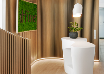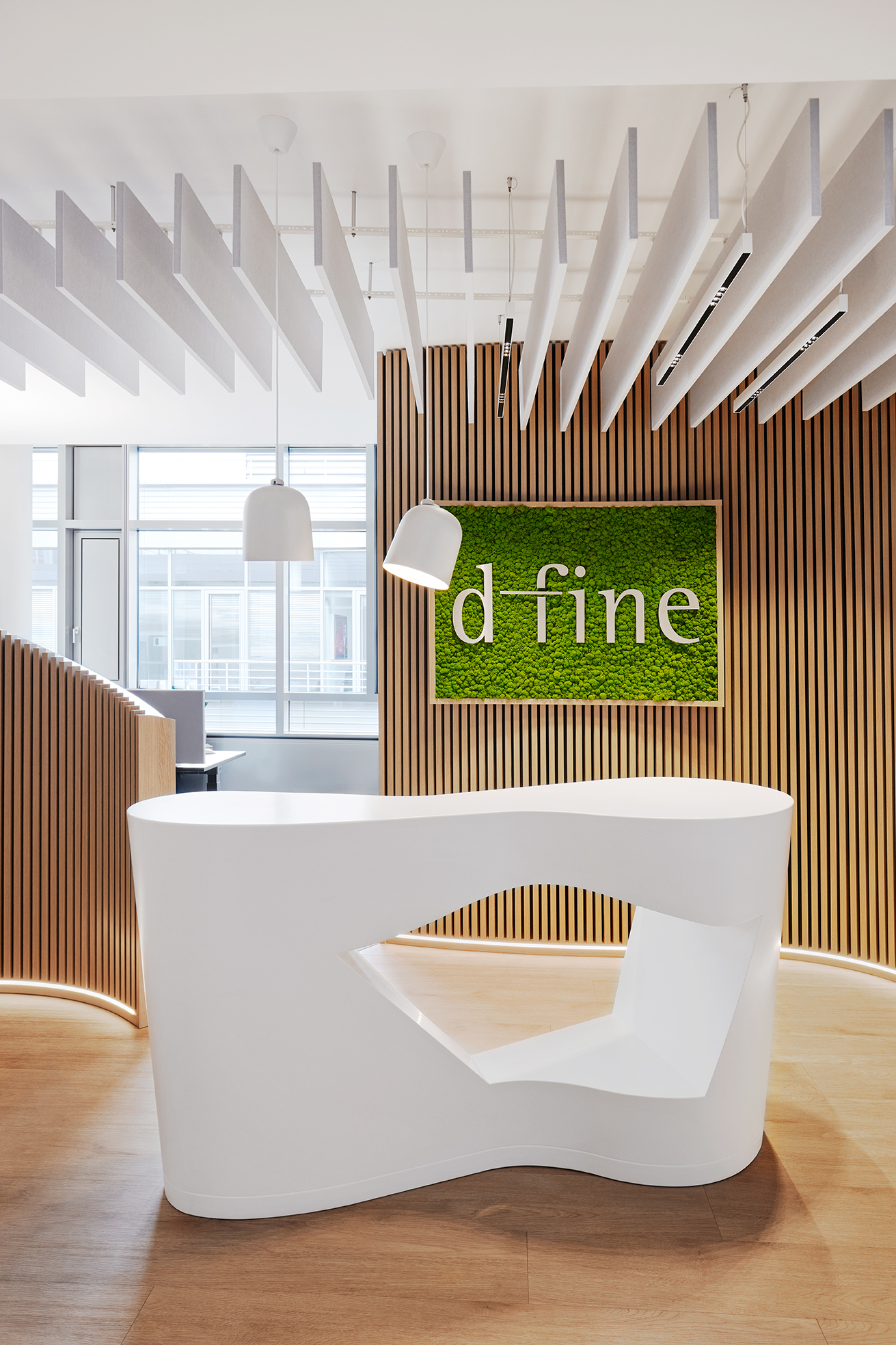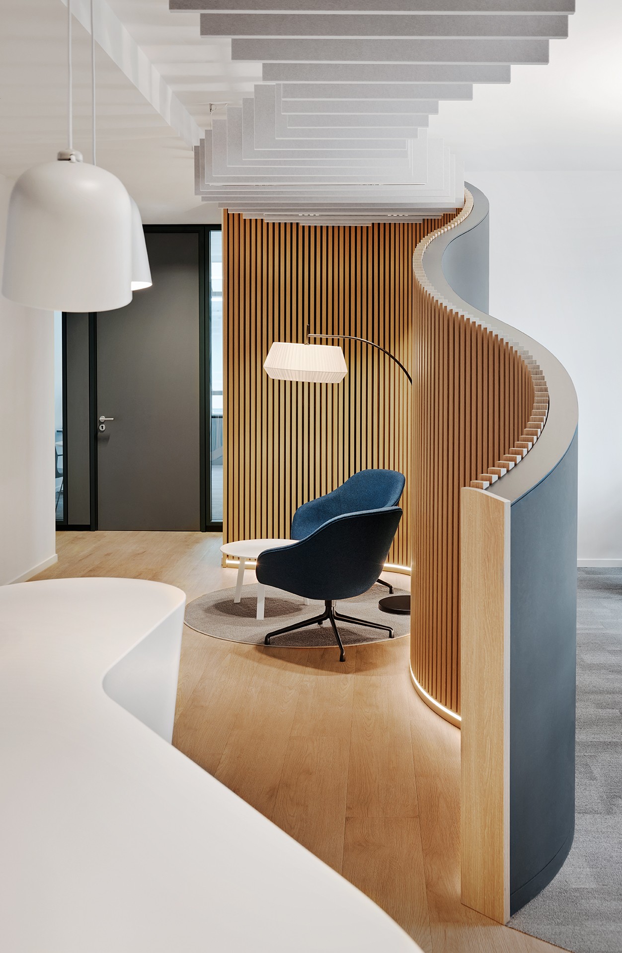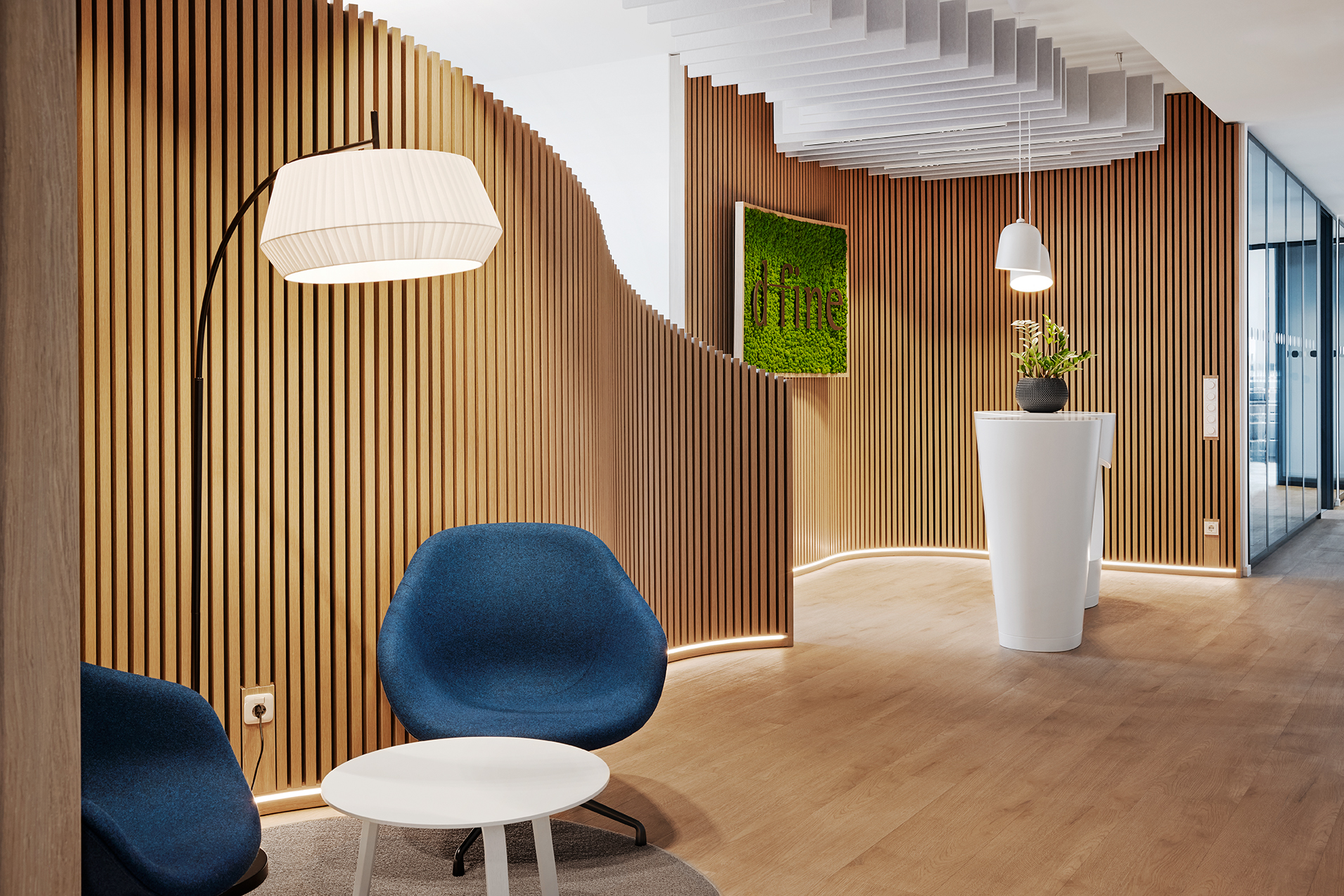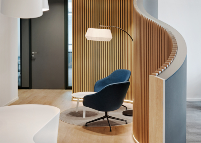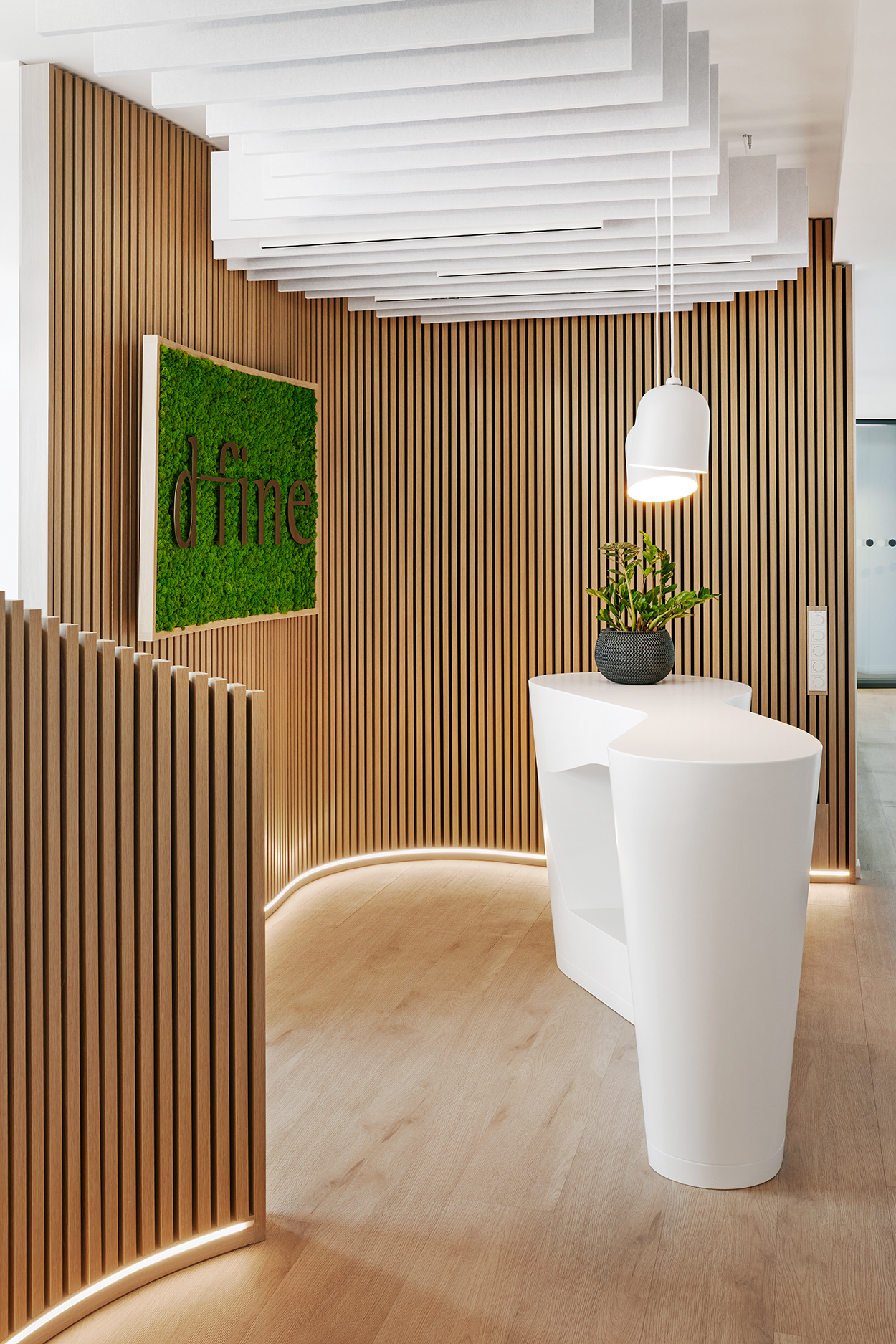Die größte Herausforderung war der Empfang: sehr schmal geschnitten, aber dennoch repräsentativ, hell und einladend. Wir entwickelten eine Lösung, die sowohl funktional als auch emotional wirkt: Ein monolithischer Tresen aus Mineralwerkstoff – wie aus einem Stück gegossen – steht als starkes Statement im Raum. Mit einem leichten Durchbruch versehen, dient er als Kommunikationsfläche und verleiht dem Eingangsbereich sofort Präsenz. Hinter dem Tresen erhebt sich eine Wandinstallation aus geschwungenen Eichenpaneelen, geräuchert und extrem biegsam verarbeitet. Sie sind mit hochwertigem Absorptionsmaterial gefüllt und nehmen den gesamten Geräuschpegel auf. Die Wand wird durch eine dezente Hintergrundbeleuchtung und Flurlichter atmosphärisch in Szene gesetzt. Sie schützt die dahinterliegenden Arbeitsplätze im Backoffice und bietet zugleich eine elegante Rückwand für wartende Besucher. Das Ergebnis: ein Empfang, der trotz enger Grundfläche Großzügigkeit, Klarheit und Modernität ausstrahlt.