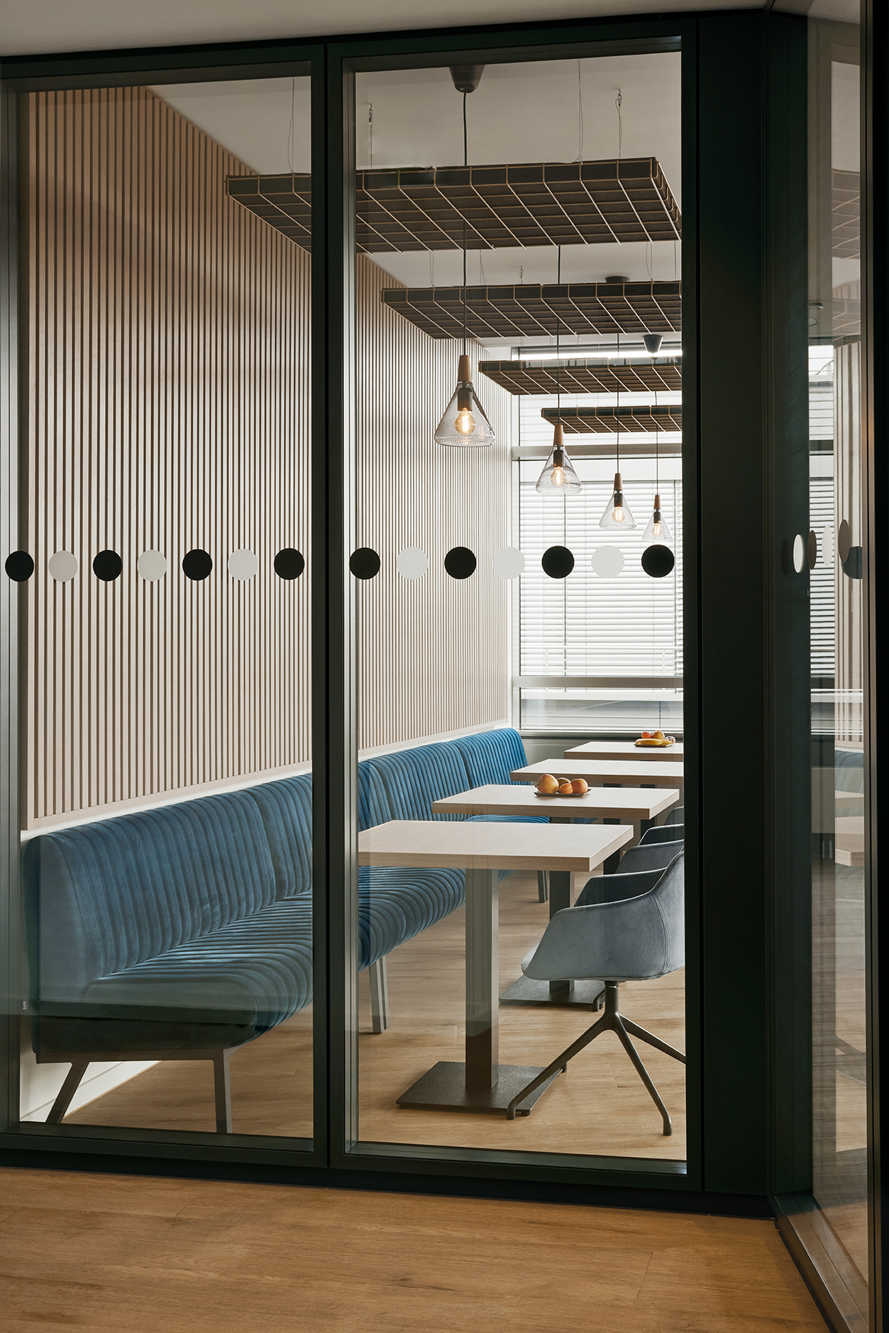 Als drittes Element entstand eine Cafeteria, die bewusst als kommunikativer Mittelpunkt gestaltet wurde. Hier können Mitarbeiter in lockerer Atmosphäre zusammenkommen: intime Sitzplätze an kleinen Tischen, gemütliche Clubsessel für entspannte Gespräche, ein Ambiente, das förmlich zu Kreativität und Austausch einlädt.