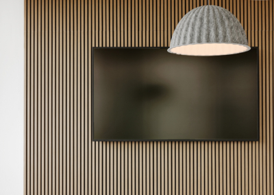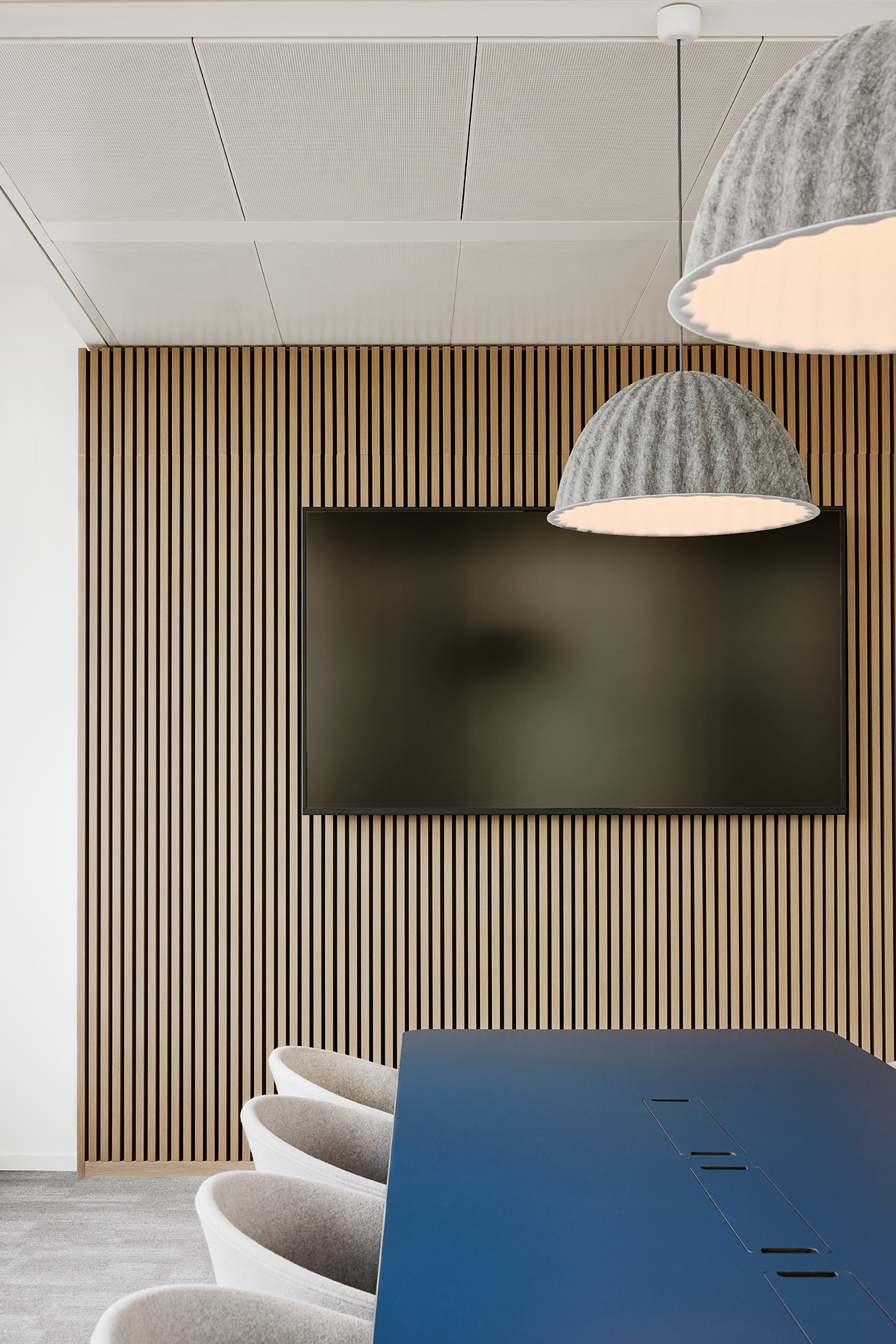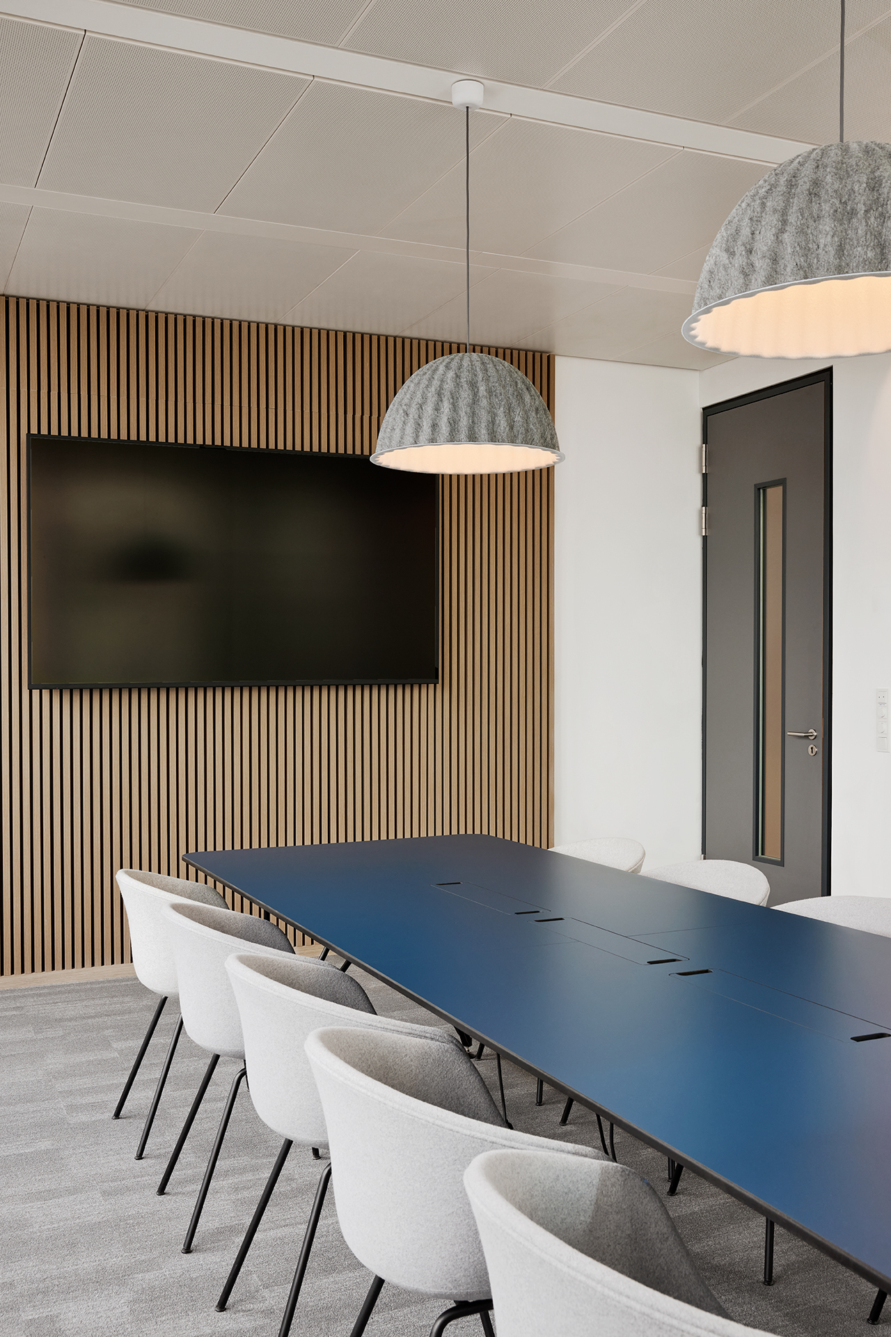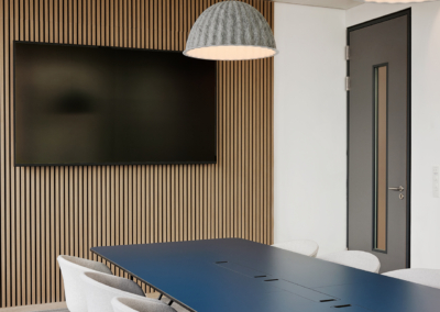 Der Konferenzraum setzt diese Sprache fort: verbindlich, reduziert und fein gestaltet. Ein raumintegrierter Schallabsorber schafft eine hervorragende Akustik und trägt zugleich den Videomonitor, der auf einem Drehschwenkarm flexibel bewegt werden kann. Damit verbindet sich ästhetisches Design mit höchster Funktionalität.