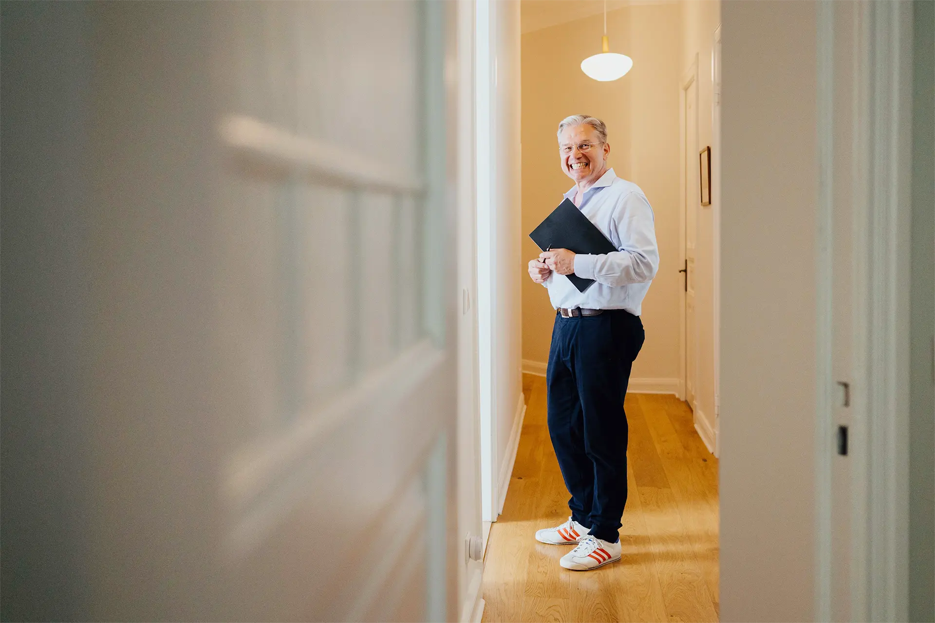 Ulrich Weinkath steht unter einer Lampe in einem Flur. Er strahlt über das ganz Gesicht.